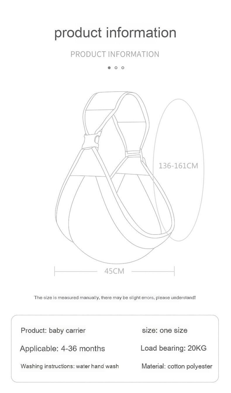 | Description | Product information: Product: Baby Carrier Applicable: 4-36 months Size: One Size Load Bearing: 20kg Washing Instructions: Water Hand Wash Material: Cotton Polyester Measurement:45cm width, 136-161cm diameter